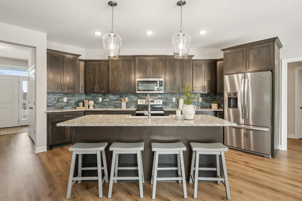 This stunning new construction home, located in a convenient Hopkins neighborhood close to HWY 169 and Excelsior Blvd, offers modern luxury and comfort. The fenced-in yard provides privacy and security, complemented by a maintenance-free deck, perfect for outdoor relaxation. An in-ground sprinkler system keeps the landscaping lush, while an electric charger in the garage adds convenience for EV owners. Inside, the spacious kitchen flows seamlessly into the living room, highlighted by custom built-ins that frame the stunning gas fireplace. The kitchen boasts a massive center island, sleek granite countertops, and stainless steel appliances. A dedicated beverage station includes a sink, water hook-up, and wine fridge. The primary bedroom boasts a private full bathroom with a deep soaker tub. Additional highlights include a charming covered front porch, abundant storage throughout, and a beautifully finished basement that offers a peaceful retreat. This home seamlessly combines modern features with timeless appeal, all within a highly sought-after location.