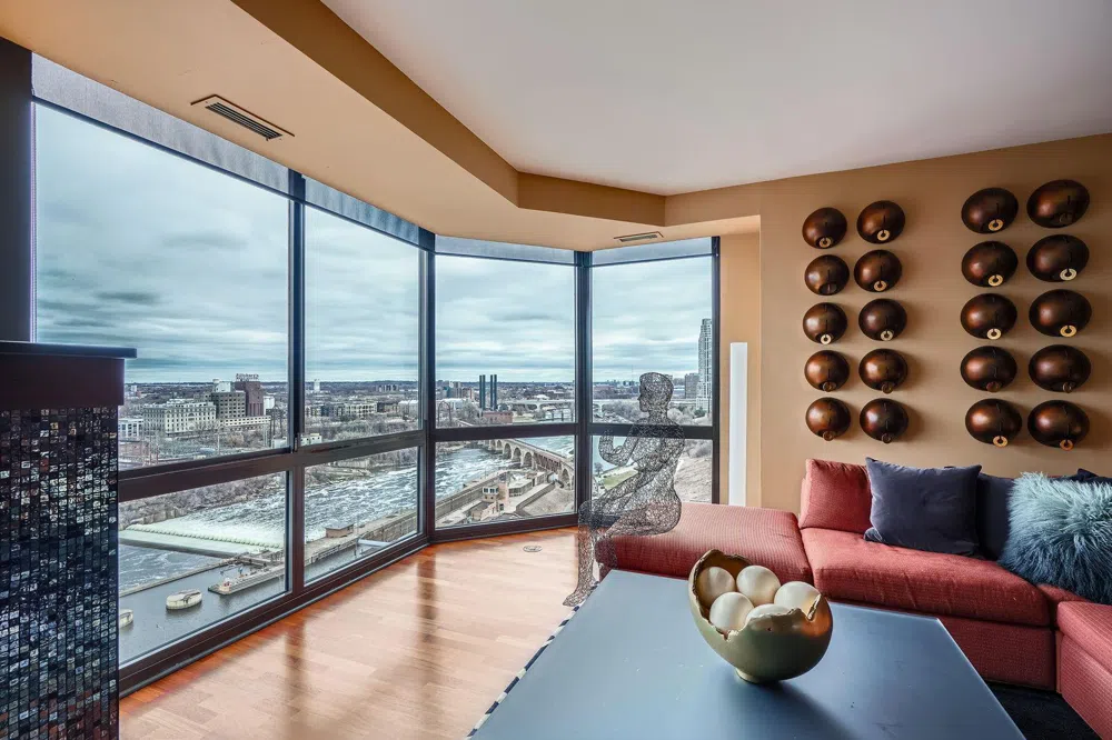 Luxury Living Awaits! Welcome to your dream two level penthouse! This exquisite 2-bedroom, 3-bathroom, 2 outdoor space residence boasts unparalleled elegance and modern amenities. Enjoy seamless indoor-outdoor living with a brand-new door leading to your expansive ROOFTOP PRIVATE OUTDOOR TERRACE, perfect for entertaining or relaxing under the stars. Everyday breathtaking views of the St Anthony falls, Stone arch bridge, Northeast skyline. All closets have been expertly outfitted with California Closet-style custom storage, maximizing space and organization. The heart of the home is the gourmet kitchen, showcasing a stunning honey-colored solid onyx backsplash with elegant metal accents. Enjoy the ambiance created by the exquisite Hubbardton Forge handmade dining light, a true statement piece. The kitchen also features hand-blown glass pendant lights, adding artistry to your culinary space. The MAIN-LEVEL BALCONY view can only be described with a single word said quietly..... WOW! Living area is enhanced with Murano glass tiles in ebony surrounding the fireplace, creating a warm and inviting atmosphere. Newly installed Brazilian Cherry engineered wood flooring on the lower level complements the high-traffic finish on the upper level and stairs, ensuring durability and style. Luxurious bathrooms, each adorned with floor-to-ceiling Carrara marble, providing a spa-like experience. The powder room features a solid granite custom sink and stunning Leon Huscha Faces wallpaper, a unique touch. When the day ends enjoy beautifully designed interior featuring custom electric blackout curtains in the primary bedroom, ensuring your comfort and privacy. All windows are adorned with Hunter Douglas blinds, combining style with functionality. Additional features include new carpet in guest bedroom/under the stairs, two hallway storage closets conveniently located next to the front door, and freshly painted exterior railings. Two spacious garage stalls conveniently located near the entrance, this home offers both luxury and convenience. This penthouse is a rare gem that combines sophistication, comfort, and modern living