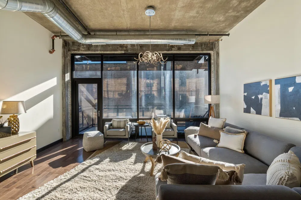 Reside in one of the most coveted buildings in the North Loop—Harvester Lofts, where history meets modern design in the heart of the city. This stunning 2 bed, 2 bath southeast-facing condo boasts expansive windows that flood the space with natural light, 12-foot concrete ceilings, exposed columns and rich, dark wood floors. Spacious balcony with a gas hookup. Updates include kitchen island, AC, and new Bosch washer and dryer. The unit comes with a heated parking spot and a storage locker for added convenience. Ideally located within walking distance to the area's top bars, restaurants, coffee shops, boutique shopping, and scenic riverfront trails.